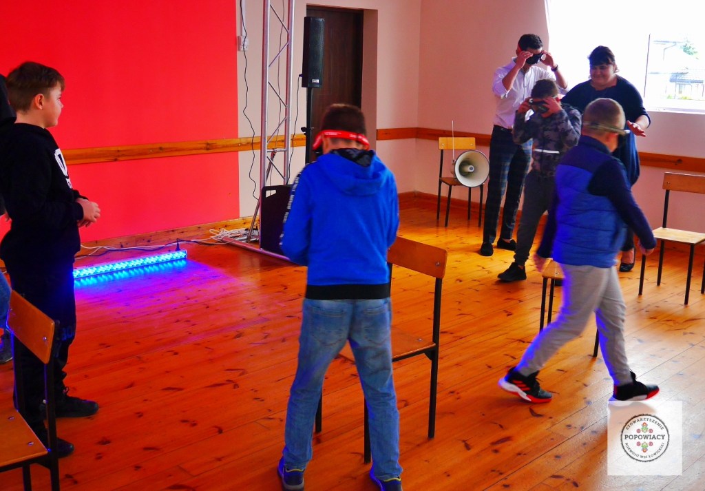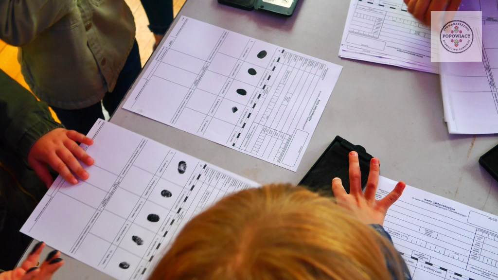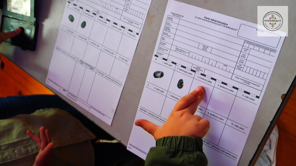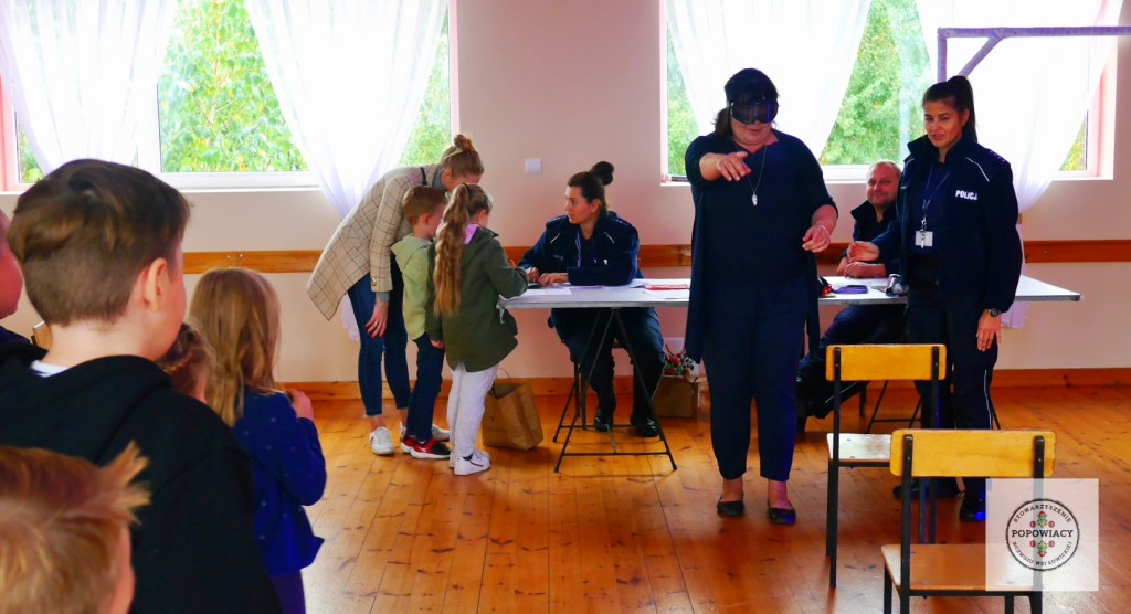 Po części teoretycznej nastąpiła pora na praktyczne zmagania. Dzieci miały okazję złożyć odciski palców na oryginalnej karcie daktyloskopijnej używanej na komisariacie. Następnie dzieci (a także dorośli!) byli poproszeni o przejście między ustawionymi krzesełkami w goglach symulujących stan po spożyciu alkoholu lub zażyciu narkotyków. Pozornie zabawne doświadczenie, jednak dające dużo do myślenia, wywołało długą i interesującą dyskusję pomiędzy rodzicami i przedstawicielami służb.