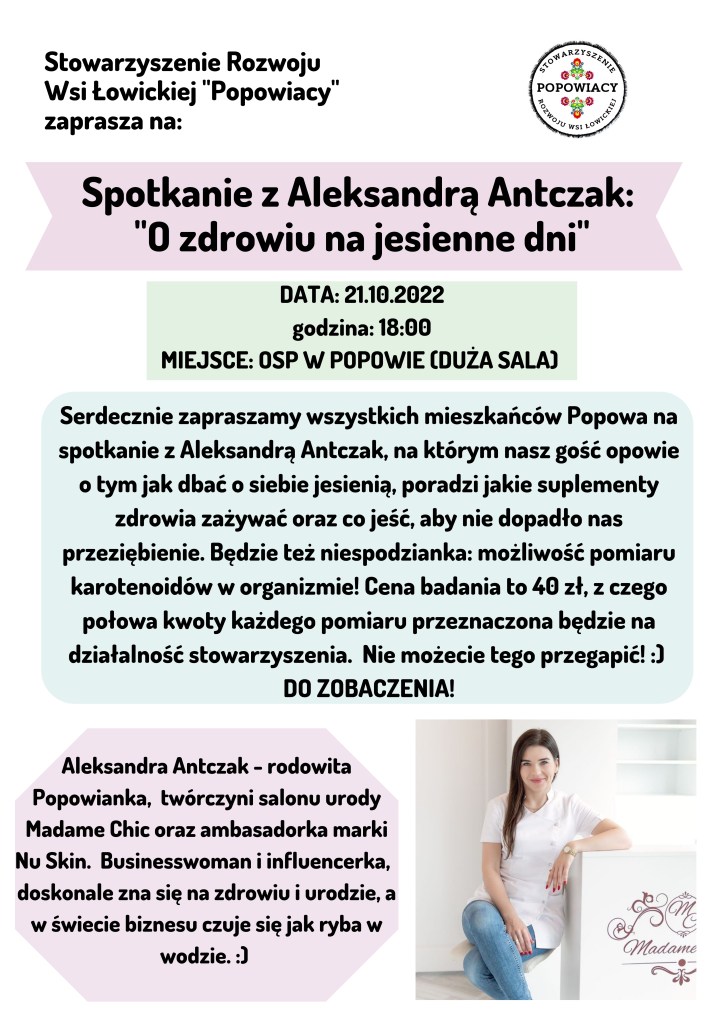 Serdecznie zapraszamy na spotkanie z Aleksandrą Antczak: „O zdrowiu na jesienne dni”, które odbędzie się 21 października 2022 o godzinie 18:00 w dużej sali w OSP w Popowie.