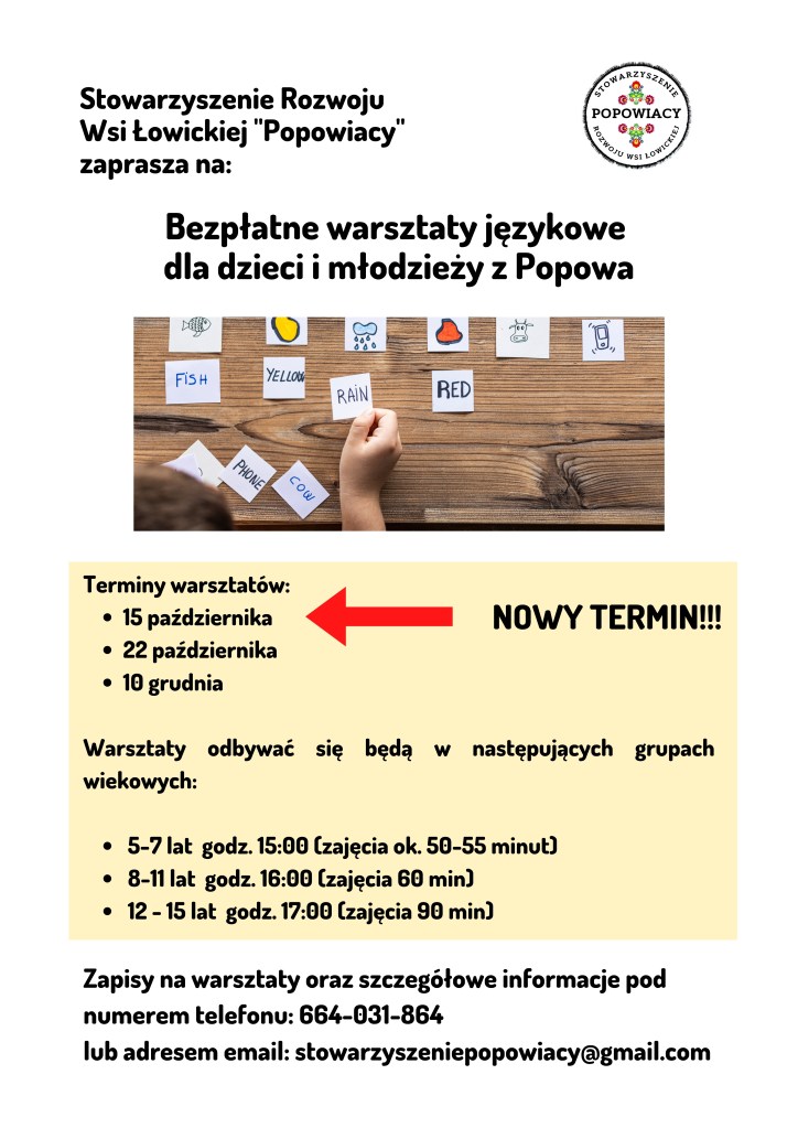W październiku i grudniu odbywać się będą warsztaty języka angielskiego dla dzieci i młodzieży. Warsztaty zaplanowane są na 15 i 22 października oraz 10 grudnia i odbywać się będą w OSP w Popowie. Zachęcamy do zapoznania się z informacjami szczegółowymi na ulotce poniżej.