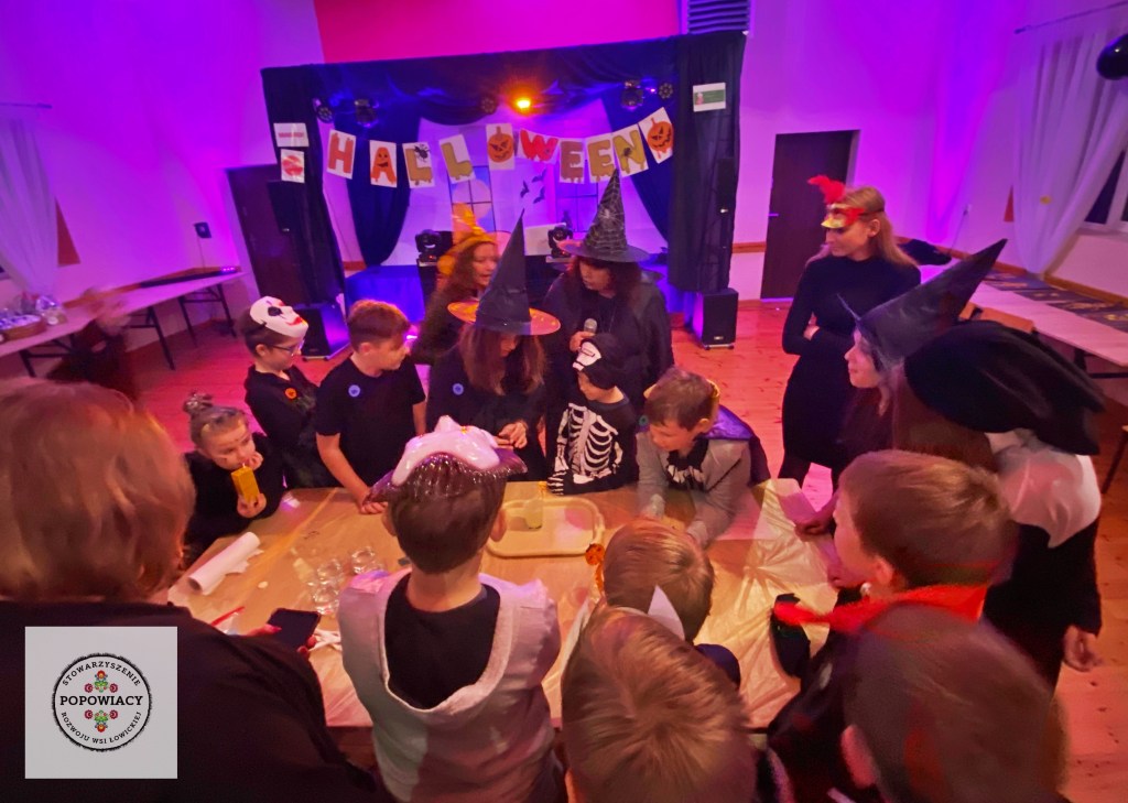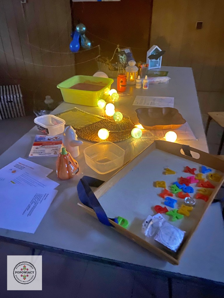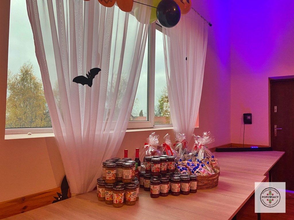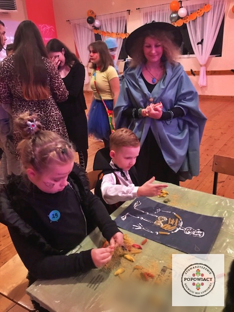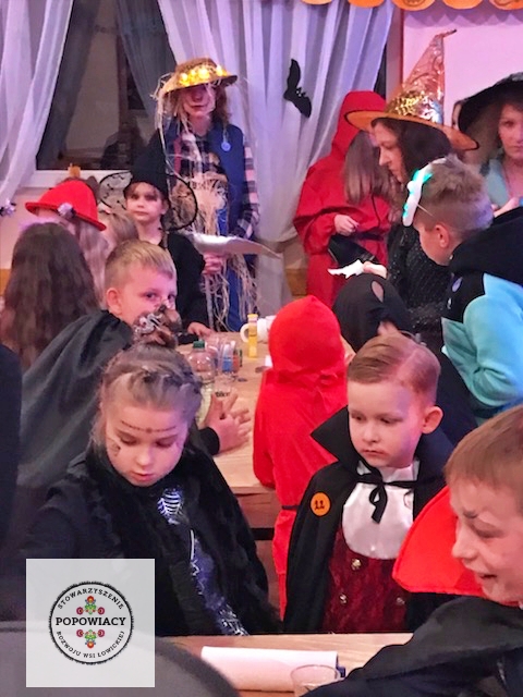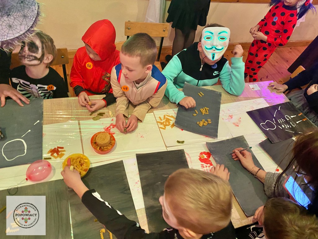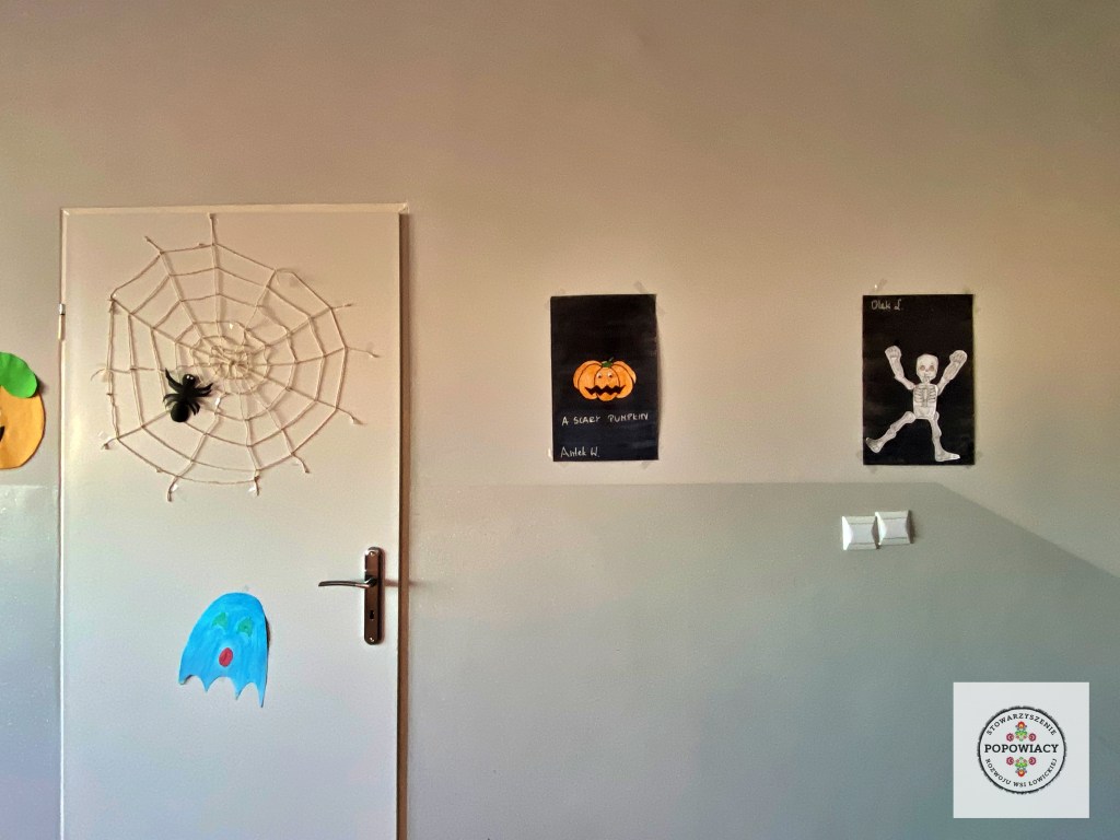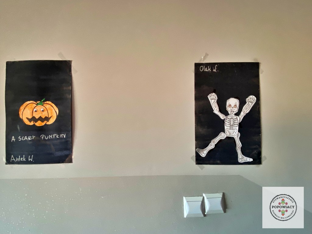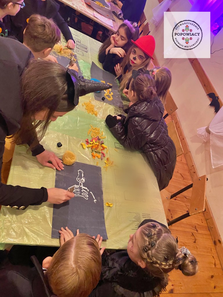 5 listopada 2022 roku w OSP w Popowie odbyła się impreza halloweenowa organizowana przez nasze stowarzyszenie. Podczas imprezy uczestnicy mieli okazję wysłuchać prezentacji na temat pochodzenia święta Halloween, skąd wzięły się zwyczaje przebierania za straszne potwory czy kościotrupy, dlaczego dynia z lampionem w środku jest symbolem Halloween oraz czemu dzieci bawią się w „cukierek albo psikus”. Po tej części prezentacji nasi najmłodsi uczestnicy otrzymali zadanie plastyczne – wylepienie swojego kościotrupa z dostępnych materiałów (kleju i różnych rodzajów makaronu). Powstały piękne prace, które w przyszłym roku będą zdobić ściany sali podczas kolejnej edycji imprezy. Oczywiście za wykonanie prac dzieci i młodzież otrzymały po cukierku, rzecz jasna. 🙂 W tym roku rodzice mogli podziwiać prace halloweenowe swoich pociech wykonane podczas warsztatów z języka angielskiego. Fotorelację z warsztatów można obejrzeć tutaj.