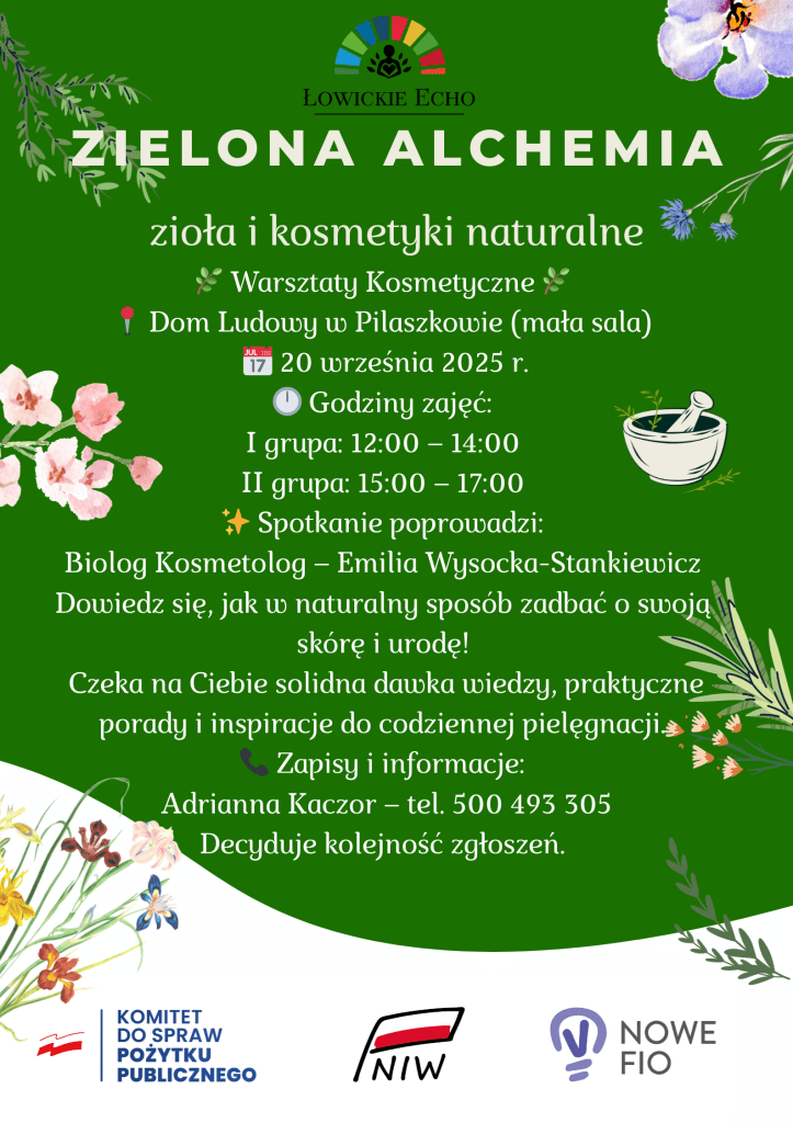 - Organizatorem warsztatów „Zielona Alchemia – zioła i kosmetyki naturalne” jest Stowarzyszenie Nowoczesnego Rozwoju Łowickie Echo.