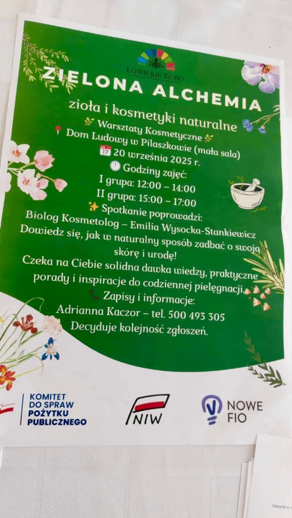 20 września 2025 r. w Domu Ludowym w Pilaszkowie odbyły się warsztaty kosmetyczne pod hasłem „Zielona Alchemia”, zorganizowane przez Stowarzyszenie Nowoczesnego Rozwoju Łowickie Echo. W wydarzeniu uczestniczyły dwie grupy – pierwsza w godzinach 12:00–14:00, a druga w 15:00–17:00.